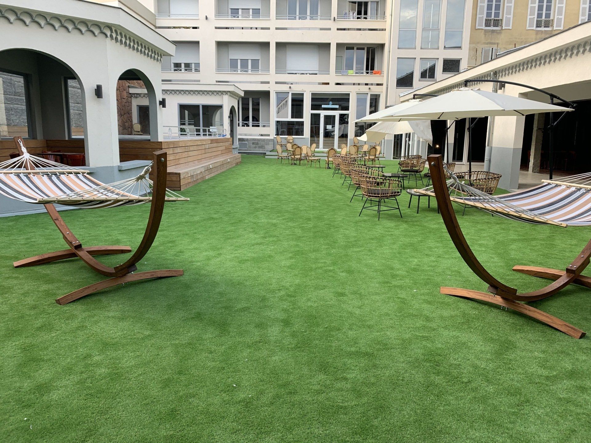 -un grand jardin intérieur avec tables et chaises, une salle de réunion, et une piscine.